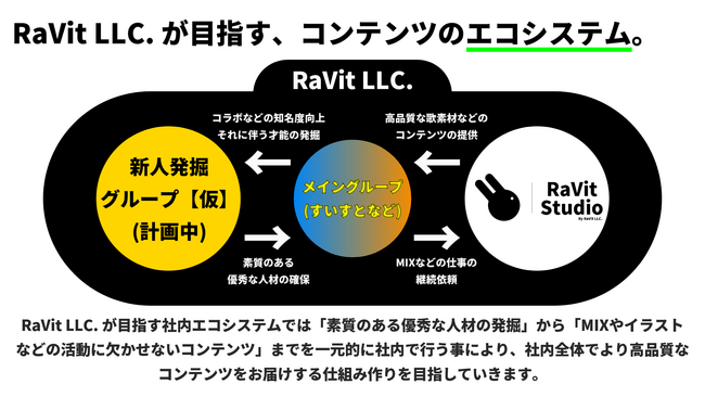 ※【すいすと】の他にも「新人発掘グループ【仮】」や、弊社が運営するプロクリエイター向けサービスである「RaVit Studio」などと緊密な連携を行う事により、自社内で完結するハイクオリティなコンテンツをお届けできる環境を整備してまいります。(※資料3 RaVit LLC.が目指す、コンテンツのエコシステム。)