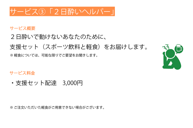 3. 二日酔いだけど家に何もない... 動けないけどすぐに飲み物や軽食が欲しい...