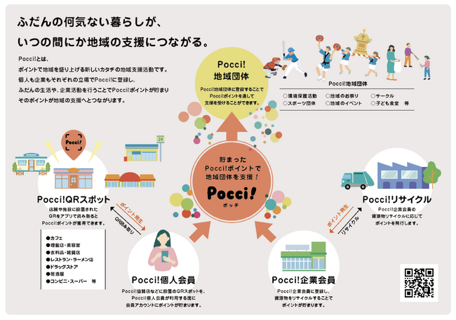 スマートフォンアプリをダウンロードして会員登録し、当サービスに協賛する対象地域エリア内の店舗・公共施設に設置されているQRを読み込むことで、アプリ上に「Pocci!ポイント」が貯まります。貯まったポイントは、スポーツ、まちづくり、伝統・文化・芸術、社会的弱者支援等の活動を展開する団体の支援に使えます。2022年11月1日より、宮城県利府町およびその周辺地域にてサービス提供を開始し、ゆくゆくは全国展開/対象地域の拡大を目指しています。