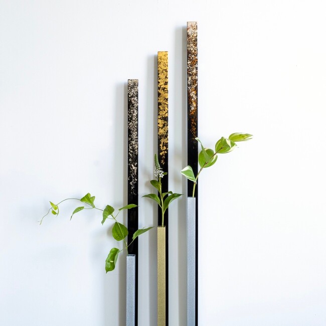 日本の伝統工芸である漆を用いた壁掛け一輪挿しです。空間の中に一本の線を引き、そこに風景をつくることを意図してデザインしています。ミニマルな形状の一輪挿しは空間を構成する一つの要素になり、細長いため自然と様々な場所に馴染みます。