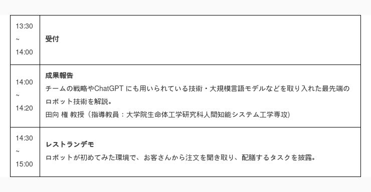 つきましては、2023年7月26日(水)に成果報告とロボットが配膳を行うタスクのデモンストレーション(レストランデモ)を開催いたします。