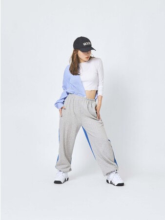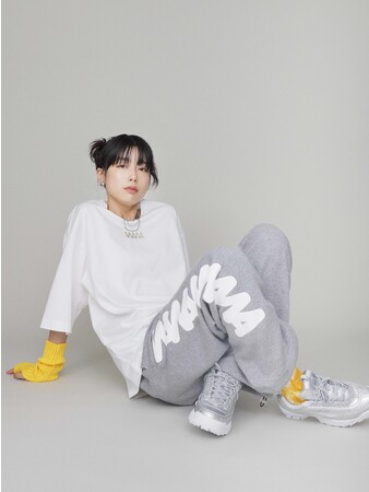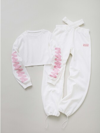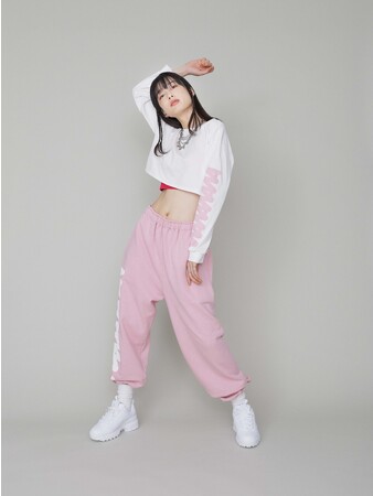 ガールズヒップホップやジャズファンク、ワック、ガールズグループなどのジャンルにオススメの、袖にロゴをデザインしたクロップドロンTとウエストクロススウェットパンツ。