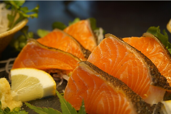 甲州ワイン鱒の味は、さっぱりとした脂乗りでクセが少なく、塩を振り皮目を炙り、お刺身でご提供。