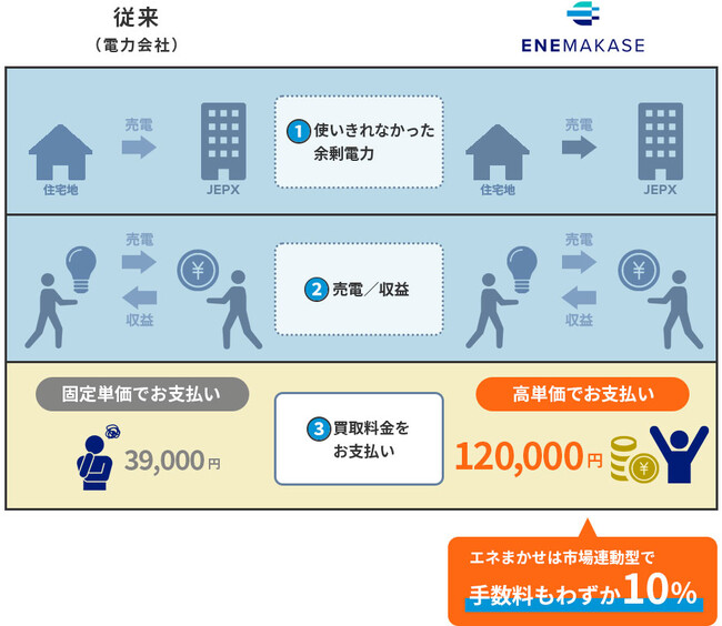 従来、固定価格買取制度(FIT)の期間満了後は各電力会社が定める買取価格での取引となり、電力需要に応じた価格での個人の売電は困難な状況でした。お客様の電力を市場価格に適した価格で売電していただきたいという想いから昨年登場したサービス『エネまかせ』は、売電を望む個人の皆様の電力を、JEPXの取引単価に連動した価格*で当社が買い取る仕組みです。*買取価格は当社取扱手数料(10%)を除いた金額になります。