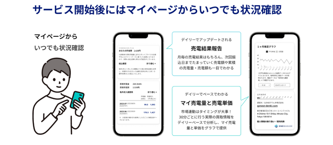 『エネまかせ』ご契約者様に向けたサービスの一環として、「マイページ」機能をオープンいたしました。マイページでは、ご契約情報の確認・管理だけでなく、次回お振込日までに貯まる売電額*が「あなたの貯金額」として毎日表示されるので、売電による収益の把握が簡単にできるようになりました。*表示される売電額は当社取扱手数料(10%)を除く前のJEPX買取金額(税込)となります。反映には約3日間のタイムラグがあります。
