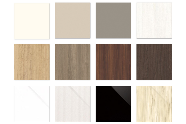 ユーザーのニーズに合わせて、豊富な色を取り揃えました。艶消し材・木目柄・鏡面仕上げ材合わせて全12色展開しています。各商品でパーツの色を変更が可能で、扉・キャビネット・それぞれで色を選択できるため、2トーンカラーといった商品も注文できます