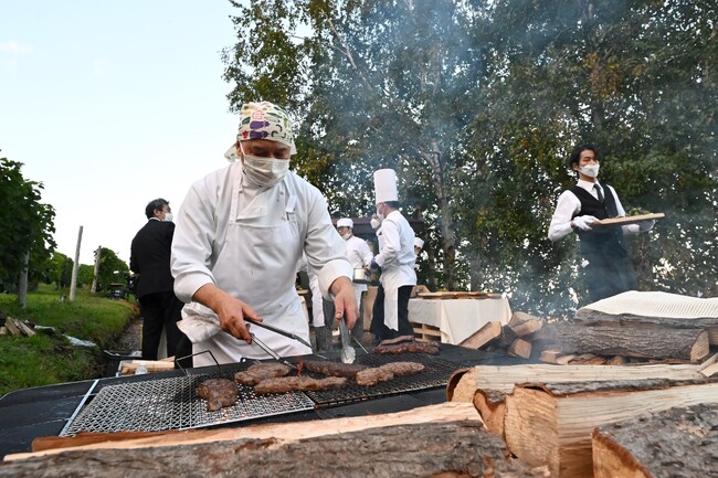 本スペシャルダイニングでは料理だけでなく、絶景絶景の中で一層華やかな雰囲気を醸成するピアノやコンテンポラリーダンス、富良野弥栄太鼓保存会による和太鼓のエンターテインメントを、食事の前には、富良野市が作るワイン畑でのブドウ収穫体験やオリジナルワインボトルづくりもお楽しみいただきます。