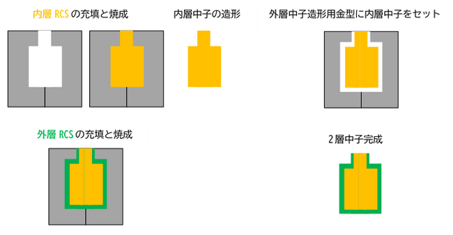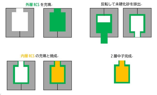 これらの課題を解決する2層式シェル中子が開発され量産されてきましたが、従来の工法では製造上の課題も複数存在し、市場ニーズに応えることが出来ておらず普及の障壁となっていました。