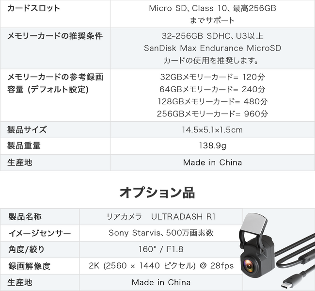 リアカメラを追加することで、3カメラ同時に2K高画質動画を撮影することが可能です。前方と後方、更に車内と3カメラ同時に録画できるため、移動中も常に安心と楽しい気分を保てます。
