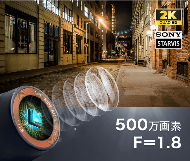 2K Quad HD (QHD 2560 x 1440 Pixels)ならではのクリアな視覚体験!信号・看板・風景・ナンバープレート・人などの周囲の状況をHD映像の4倍ほどくっきり記録できます。さらに、高性能SONY STARVISセンサーIMX335を搭載、F1.8の大口径に6層ガラスレンズを採用したことにより、明暗差を補正し鮮明で綺麗な映像を捉えます。