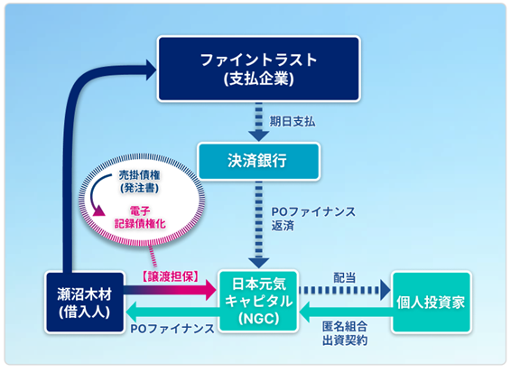 ・募集内容:匿名組合出資における営業者である日本元気キャピタル社(本社:神奈川県横浜市港北区新横浜、代表取締役:兼松誠司、貸金業登録番号:神奈川県知事(2)第05049号、以下「NGC」)が瀬沼木材社がファイントラスト社より受注しているマンション建設工事の発注書を担保に1,000万円を融資する事業へ出資するファンドとなります。資金使途は瀬沼木材社の運転資金となります。発注書はトランザックス社の「POファイナンス(R)︎(POファイナンス(R)︎はTranzax株式会社の商標登録されたサービスです)」のシステムを活用し電子記録債権化されます。