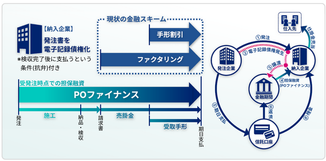 発注企業、納入企業、金融機関をインターネット上でつなぎ、受発注書を電子記録債権化することにより、これまでは難しかった金融機関による受発注時点からの担保融資を可能としたサービスです。