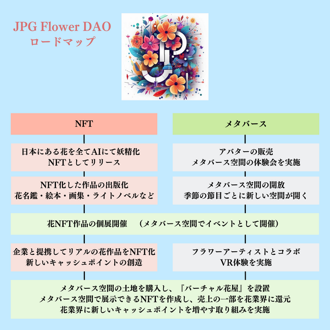 『JPG Flower DAO』は「NFT・メタバース・AIといったテクノロジーを活用し、花産業を盛り上げる」がコンセプトの次世代型花コミュニティ(DAO)です。デジタルとリアルの世界を融合させ、花に対する需要を総合的に高めることを目標としています。