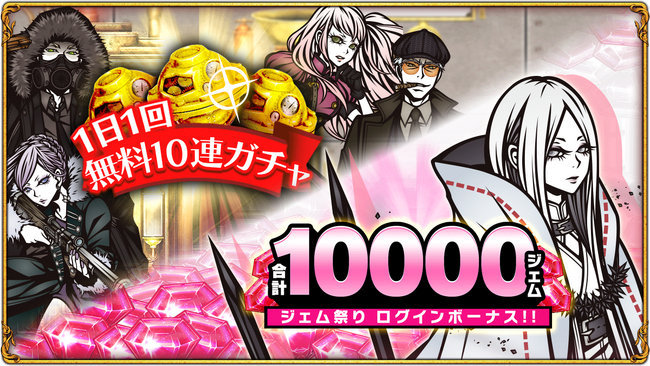 さらに、期間中1日1回10連ガチャ無料&ジェム祭りログインボーナスを開催します。皆様奮ってご参加ください!