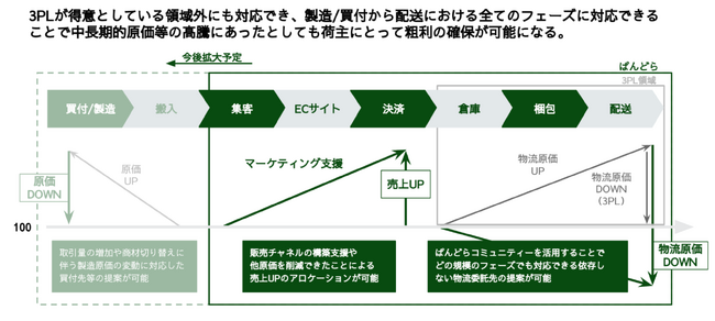 →販路の拡大をぱんどらが支援することで、倉庫で受託する案件の総量が増える