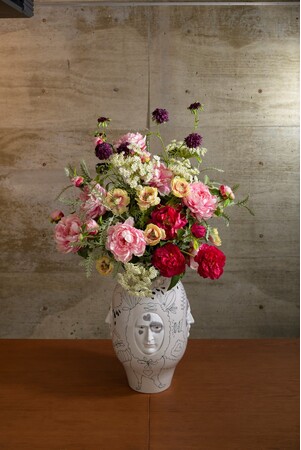 存在感ある印象的な花器に、ふわりとやわらかで可憐なピオニー(芍薬)を贅沢にデザイン。ピンクの濃淡が色鮮やかに映え、大ぶりで満開のピオニーの表情は、インテリアのアクセントに。