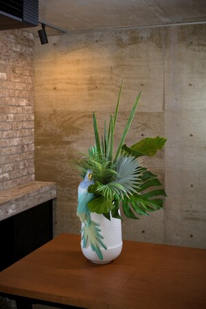 大きな葉が特徴で生命力あふれるモンステラの躍動感と、色鮮やかなコンゴウインコがマッチしたデザイン。大胆で独創的なデザインは、生き生きとした空間を演出します。