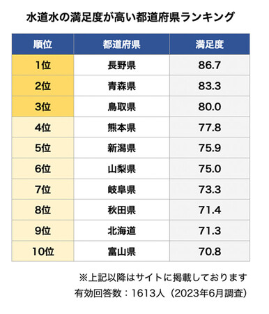 水道水の満足度ランキングの上位には豊かな自然と水源を有する都道府県が並びました。