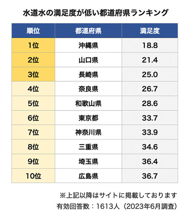 一方で、水道水の満足度が低い都道府県を低い順に並べてみると、東京、神奈川、埼玉、広島、大阪、福岡などの都市部が並びました。
