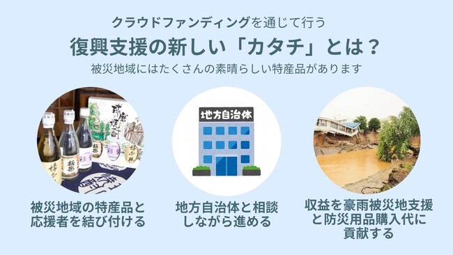 被災地域の特産品と応援者を結び付け、収益を豪雨被災地支援と防災用品購入代に貢献するクラウドファンディングを、被災経験のある大学生が取り組みます。
