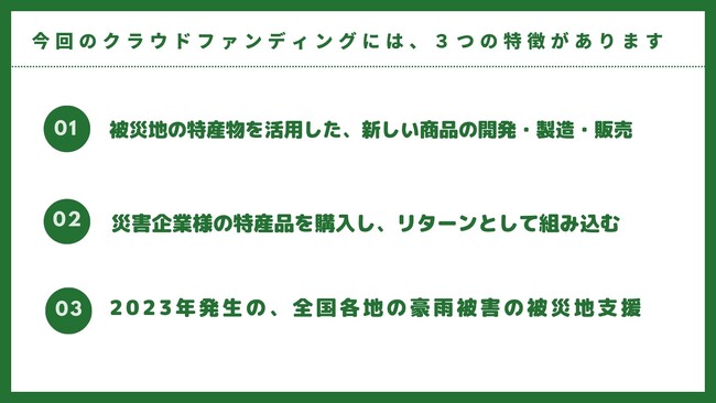 被災地域の特産品を広く広める事も復興と被災地の活力になると捉え、被災地の特産品を新たなカタチにし、地域活性化に繋げるためのクラウドファンディングを実施します。