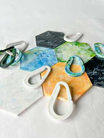 素材の色が活かされたカラフルなマーブル模様が特徴の再生プラスチックグッズ