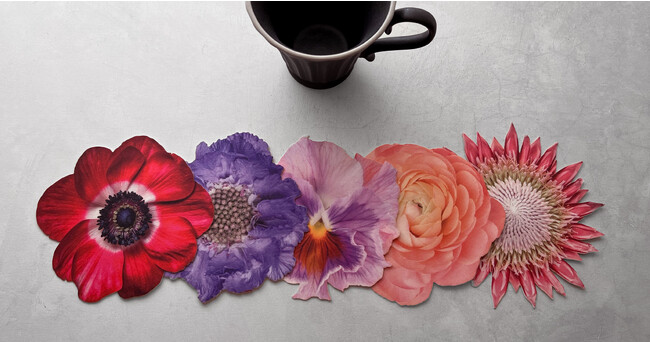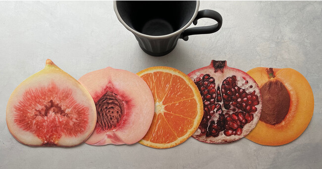少しマニアックでめずらしい種類を加えた、みずみずしいフルーツや花々など、高精細のレーザーカットやプロッターカットを駆使したフリーカットのコースターがテーブルをスタイリッシュに演出します。上質な紙製で驚くほど吸水性が良く、ソフトな質感で、テーブルの表面を水染み、熱、ひっかき傷から守ります。
