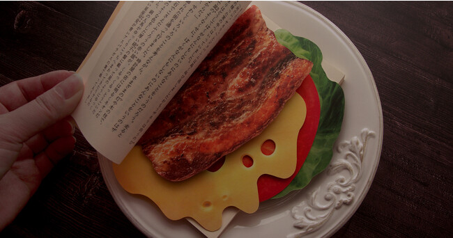 本を食パンに見立てて、ページにリアルなベーコンやチーズの具をはさんでいく、ベーコンレタストマトのしおりや、チョコバナナ、フルーツサンドなど。文庫本のページにきれいに収まるサイズのしおりです。