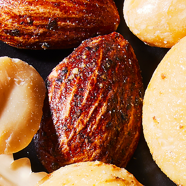 「コク旨しょうがしょうが&ガーリック」はナッツ1種類ごとにそれぞれ味付けをし、ムラなく濃い味わいが楽しめるように工夫しました。また「ペッパー&チーズ」については、アーモンドにブラックペッパー、カシューナッツに赤胡椒、マカダミアナッツとピーナッツには3種類のチーズと、ナッツによって違う味が楽しめるようにしています。本品を食べながら楽しいひと時をお過ごしください。