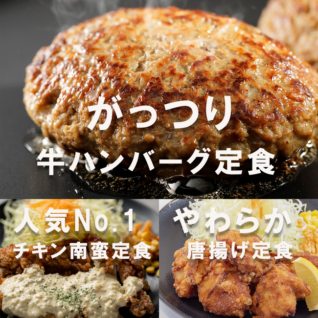 お店でも大人気の1.ハンバーグ、2.チキン南蛮、3.唐揚げの3種の定食がセットになって、お店の味そのまま急速冷凍でお届け!