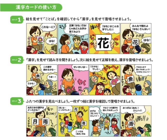 また、読める漢字が多いと読書量が増え、低学年のうちに読書習慣が身につきやすいため、今、よく懸念されている語彙や読解力の低下をふせぎ、学力アップの土台となります。このように「漢字よむよむカード」は、幼児期における教育の効果がある教材です。
