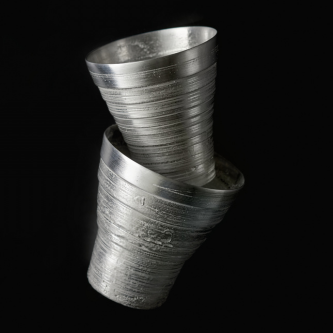 錫製酒器のデザインは、福岡県芦屋町に広がる空と海との境界線、悠久の重なりを伝える芦屋層群、2つのそれぞれの景色をイメージし、製作した二つ一組の酒器となります。