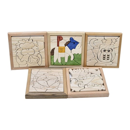 クマやサルなどの動物をかたどった木製パズル。ピースにはとがった角がなく、小さなお子様にも安心して遊んでいただけます。収納用の木枠はフォトフレーム仕様で、お部屋のインテリアにもぴったりです。販売価格(税込):2,200円