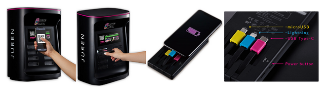 鉄道や商業施設などの公共エリアを中心に、現在、全国各地の約3,000箇所にレンタルスタンドを設置。一台330円(税込)で、レンタル当日から翌日24時まで利用可能で「充レン」のレンタルスタンドであれば、どこでも返却可能。3種類の接続端子を装備しており、様々な端末に対応可能。充レンで充電する電気は、すべてグリーン電力証書を取得したクリーンな電力で提供。設置場所・ご利用方法等に関するお問い合わせは公式Webサイト(https://ju-ren.jp/)をご覧ください。