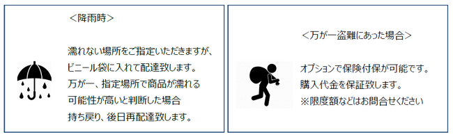 置き配を利用したいが不安要素が多く利用を躊躇される方もいらっしゃいます。代表的な不安要素は降雨時に商品が濡れてしまう、受け取るまでの盗難があります。置ToC(おいとっく) では、降雨時はビニール袋に入れて配達します、また荷物が濡れる可能性がある場合は配達員が持ち戻りし後日再配達致します。万が一の盗難時には商品代金を保証する保険をオプションでご用意しております。また配達事前通知、配達完了通知をお客様の登録メールアドレスにお送りしますので受け取るタイミングを事前にご確認できて安心です。