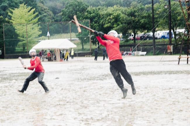 1.2kgある被打棒が回転しながら高速で飛んでくる為、常に危険が伴います。チーム内の連携が取れなければ互いを棍棒で殴り合う羽目にもなります。それ故に緊張感と戦略性が必要となる為、実は攻撃よりも守備のゲーム性の方が高い競技となっています。人生を棒にふる覚悟を決めた選手たちの熱い戦いをご覧ください。