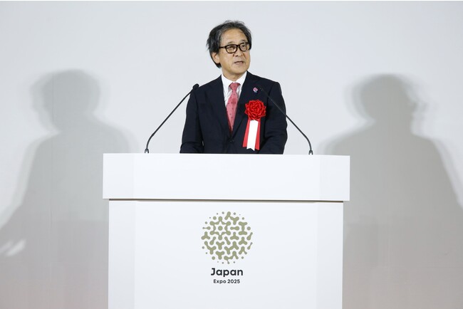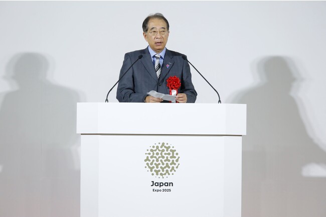 博覧会協会代表挨拶では、「開催国政府として、テーマをプレゼンテーションする拠点であり、いわば万博の顔という重要な場所。前回、前々回のパビリオンのメッセージ性の強さが印象に残っており、そのようなパビリオンを超えたパビリオンになることを目指しております」と意気込みを述べ、「日本館のテーマ、来場者一人一人が他の命との繋がりや循環の中で生かされていることに気づくこと、持続可能性の問題を自分のこととして考えること、それぞれの行動を変えていくことを目指すという素晴らしいアイデアであり、万博の力を信じて日本館の存在が新時代の万博を実現する中核となり、日本館が末長く、人々の心に残るパビリオンとなり、大阪・関西万博の成功となることを願います」と挨拶を締め括りました。