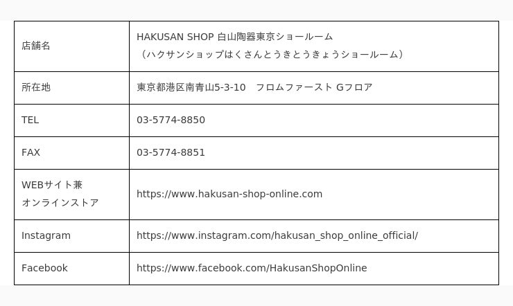 HAKUSAN SHOP 白山陶器東京ショールーム 店舗概要