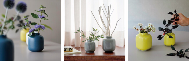 多様な植物にあわせやすい白とグレイ、インテリアのアクセントとしても存在感のあるイエローとブルーの4色展開。小さなブーケや庭の草花を食卓や部屋に飾るのに程よいサイズ感で、花瓶以外にもリードディフューザーの容器に活用できます。水の出し入れもしやすく、洗いやすい口の大きさにこだわってデザインしました。