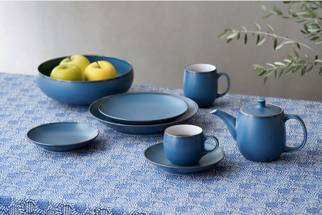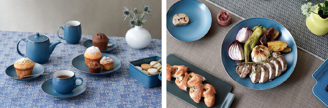 くすみがかったブルーマットの新しい釉薬は、窯の中の変化で出現する結晶の表情が魅力的。1960~70年代に生産されていた釉薬を基に、より現代の空間に似合うよう調合を一から見直しました。「クラシック」シリーズだけではなく、11月に発売する新シリーズの「AMUSE」、「HOURS」、「POTA」にもカラー展開しています。