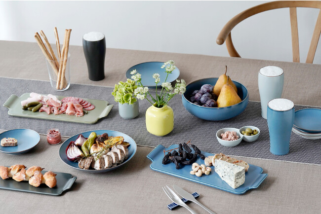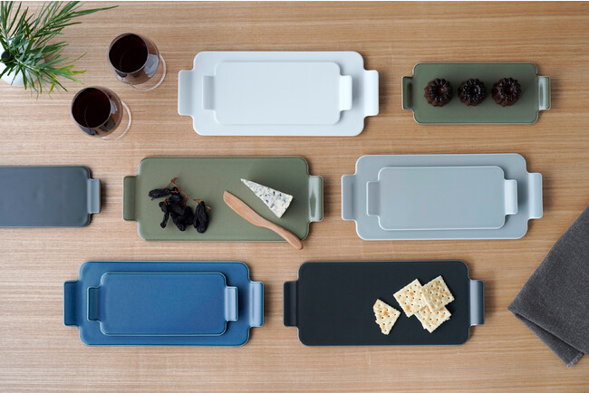 美味しいお酒やおつまみを用意してテーブルを囲むパーティーシーンに活躍する“サービングトレイ”の提案です。マット調の落ち着いた釉薬を使った5色展開のカラーバリエーションで、お酒の席での前菜やおつまみに、フルーツやスイーツなどデザートの盛り合わせに、お寿司やおにぎりなど和食にも似合います。