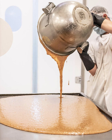 イズニーキャラメルは、混ぜる、煮詰める、型に流し込み冷やす、折りたたむ、細長く伸ばしてカットするなど、職人たちの丁寧な手仕事により生み出されています。工場では、キャラメル作りの工程を見学することもできます。