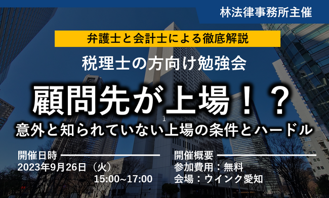 企業の法律問題に精通した林法律事務所(所在地:愛知県名古屋市、代表:林 宗範)は、『金融機関出身の弁護士による税理士の方向け勉強会~顧問先が上場?意外と知られていない上場の条件とハードル~』をウインク愛知にて9月26日(火)に開催いたします。 経営者にとって最も身近な存在である税理士の先生方には、実際にクライアントの経営者より上場に関するご相談を受けている方もいらっしゃるのではないでしょうか。 会社の成長戦略として注目されている「東京プロマーケット」の活用方法について具体的な事例を交えて解説いたします。 「東京プロマーケット」とは東京証券取引所が運営する株式市場であり、一般市場よりも審査に通りやすい、コストも抑えられるといった特徴があります。 本勉強会では会計士の新開智之先生(監査法人コスモス 統括代表社員)にもご登壇いただき、実際の事例を交えながらわかりやすく解説いたします! 上場に少しでもご関心のある先生方、顧問先の次なる成長戦略を描こうとしている先生方に是非おすすめのセミナーです!