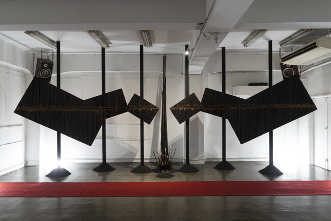 約 10.000 本の裂いた竹を焦がし割った部分の色とのコントラストを造形物として構築し たインスタレーション作品。線上に重ねた竹の間に並ぶの南天の実は、人間の松果体の高 さの平均値に位置づけられている。オープニングレセプションでは、新作のパフォーミングアートも披露された。