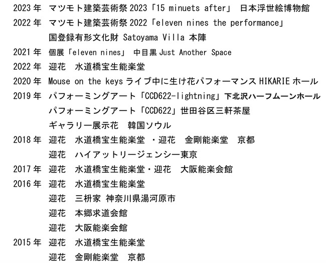 洋画家であった父の影響で幼少の頃より美術に囲まれた環境で育ち、学生時代は油絵を学んだ。10代後半で上京しファッションデザイナーを生業にするも、芸術との格差に違和感を覚え始めていた頃に生け花に出会う。以来古典的なものから、現代美術として独自の解釈をした作品を創作し、国内の主要な能楽堂、ラグジュアリーホテル、映画のセット内にて装花及びディレクションなど大規模なものから、有名旅館や飲食店、ファッションブランドの展示会などミニマムな要素を必要とするものまで幅広く携わり、その活動エリアは日本のみならず、NY、ソウル、ブエノスアイレスと広範囲に渡る。昨年より開催されたマツモト建築芸術祭では2年連続アソシエイトプログラムをトータルプロデュース、国登録有形文化財 Satoyama Villa 本陣、建築家・篠原一男の設計の日本浮世絵博物館にて宝生流能楽師 辰巳満次郎、アオイヤマダ、スティーブエトウ、Daisuke Niitome(mouth on the keys)らとコラボレーションを行う。