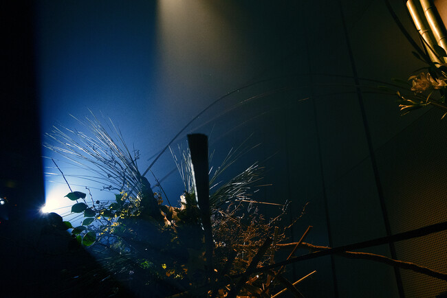 今回の展覧会は、その不明瞭なものを取り払い、真髄を見出すべく、人間が花を何かの切欠で生けだした時の事を想像し構成致します。文明や文化が築かれる以前の、飾られていた目的が明確ではない花を、今の時代に時間移動させたような演出をし、観る側の想像力増加の切欠となるような設え。また生け花は植物を素材にした極めてアナログな余白までも重視した空間/視覚芸術であるという基本概念を再認識しつつ、更に発展させる為、これまで行われた事のない鑑賞者の体感温度や時間軸変化の錯覚も今回の展示では試みます。(本展はベルリンへ巡回を予定)