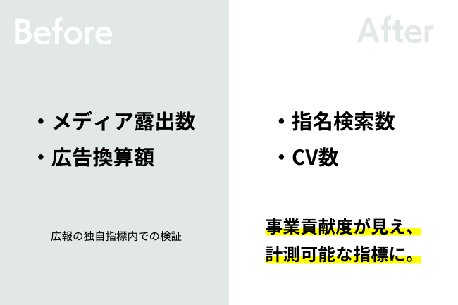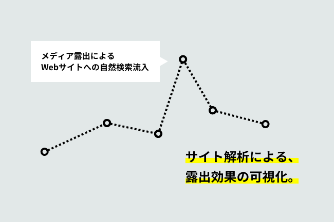 指名検索数をベースの指標とし、その推移を定点観測しながら広報効果を計測します。また、メディア露出時(特にTV)のWebサイトへのアクセス状況やコンバージョンを解析ツールを用いて計測し、メディア露出単位の反響も数値化します。