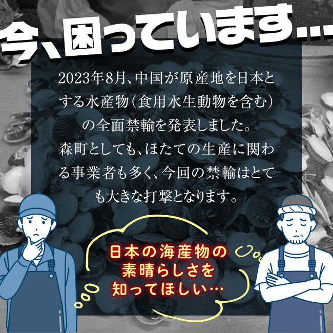 北海道森町(https://www.town.hokkaido-mori.lg.jp/)は、この度発生した中国による水産物輸入停止措置により、被害が拡大しているほたて生産者支援を目的とした「ほたて生産者応援企画」を開始したことをお知らせします。