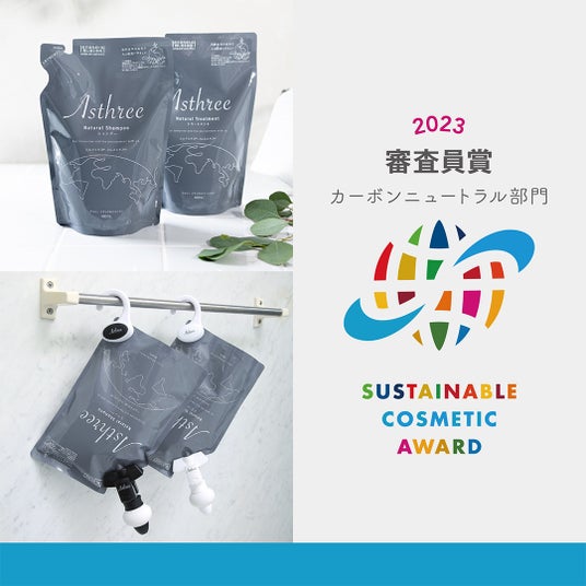 この度、弊社ALYCE(株)のブランドAsthreeの「アスリーナチュラルシャンプー・トリートメント」が サステナブルコスメアワード2023で「審査員賞:カーボンニュートラル部門」を受賞いたしましたことをご報告させていただきます。