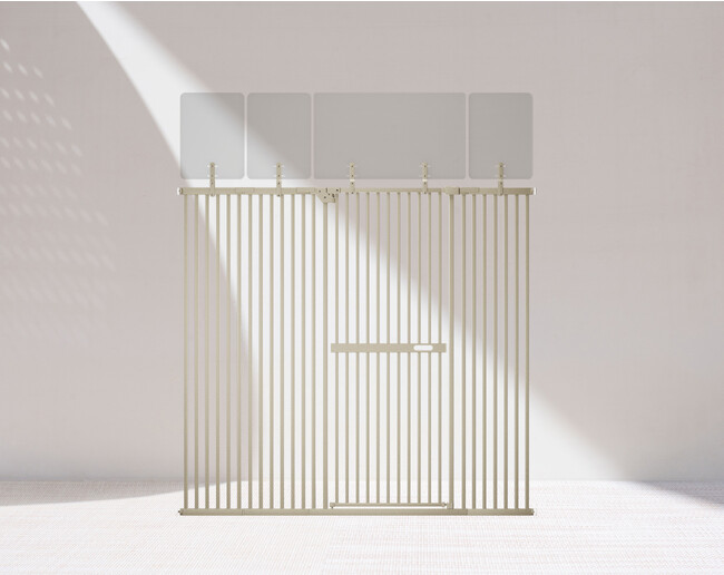 75~175cmの幅広い設置幅に対応する、高さ190cmの猫対応フェンス。すり抜けを強力に防止するだけでなく、インテリアにも馴染むデザインと使いやすさが特徴。